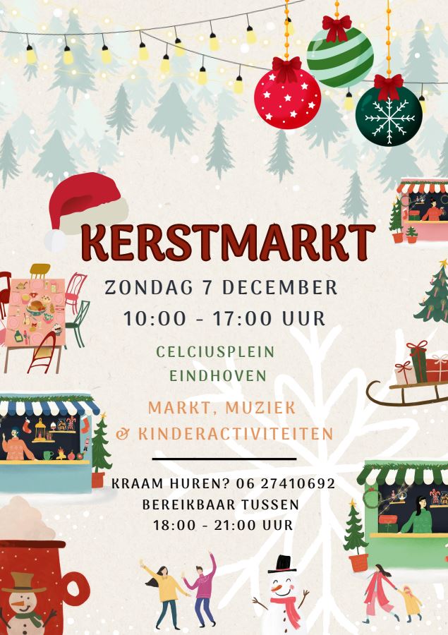 Kom zondag 7 december 2025 naar de Kerstmarkt: Met muziek, eetkraampjes en kinderactiviteiten. Te vinden op het Celsiusplein van 10:00 tot 17:00 uur